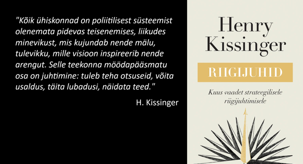 Nojah. Eks iga teksti võib mõista mitmeti. Raamatu lõpus jõuab Kissinger tegelikult välja ka sõjani Ukrainas. Tema sõnul oli Venemaa sissetung Ukrainasse nurjunud või liiga napi strateegilise dialoogi tagajärg. Kui vaadata Trumpi tegevust sellest eeldusest lähtudes, siis üritab ta ju viia praegu suhetes Venemaaga omal moel ellu just Kissingeri õpetust. Samuti tuleb seda raamatut lugedes välja muidki paralleele, mis jätavad mulje, et Trumpki on seda lugenud ning üritab järgida, aga kohati liiga sõna-sõnalt ja sirgjooneliselt, mistõttu kipub tulemus olema pahatihti (ma ei leidnud selle kirjeldamiseks praegu head sõna) ohkama panev.
